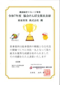 令和7年10月10日、協会けんぽ鳥取支部より「健康経営マイレージ事業 令和7年度協会けんぽ支部長表彰」を受賞しました。3年連続3回目の受賞となりました。